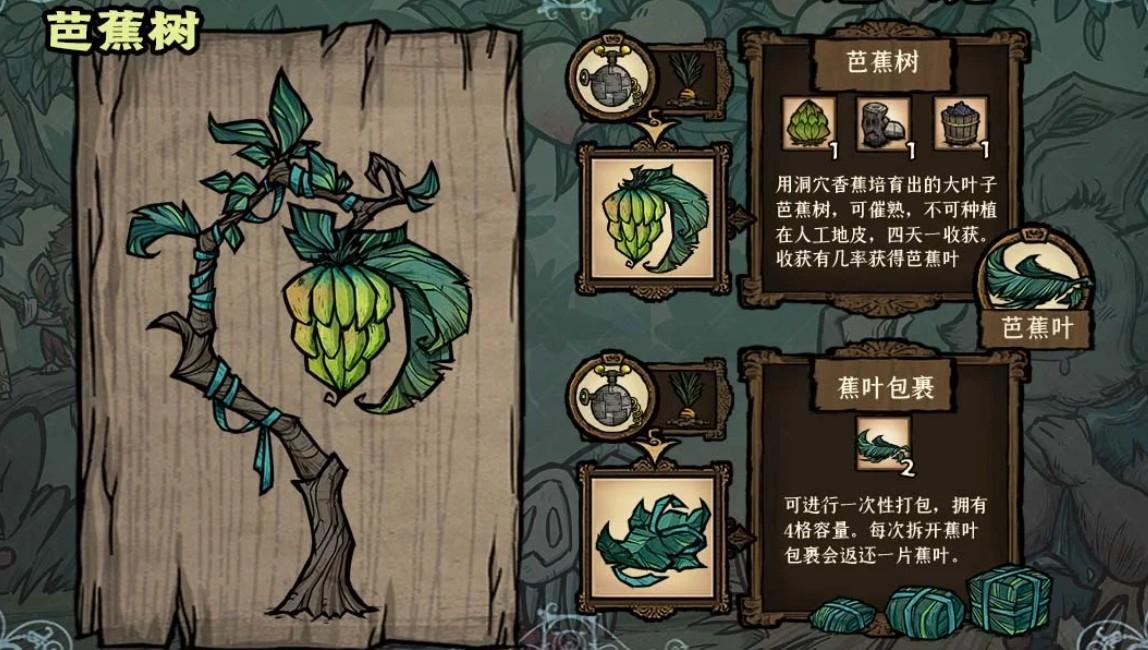 神话版的芭蕉树和洞穴里面一样,每四天能收获一次。它需要消耗香蕉、活木、肥料桶,再加上两本科学就能解锁。其能够被催熟,但和浆果丛一样不能种在人工地面上。对成熟的树进行采集的时候,能得到一份香蕉和一点五份的芭蕉叶。其中芭蕉叶能够燃烧,最大能够堆到二十份。它的燃烧值同草差不多,能放在锅里但没有可食用度。用两份叶子能做出蕉叶包裹,它和星盛宴的礼物包有所相似。可用在一次性打包之后,拆包之后仅仅会返还一片蕉叶。