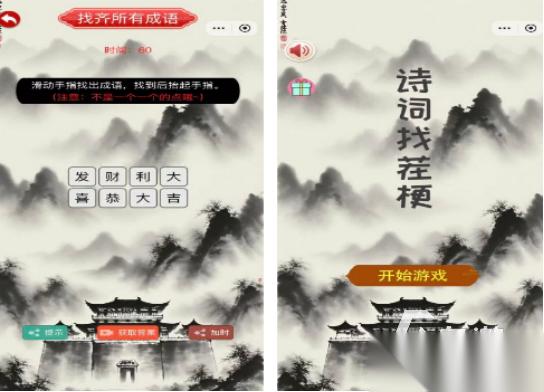 在锻炼脑筋的时候,此休闲类型的,涵盖传统的诗词文化,也有超多的玩法,必须要根据每一个关卡当中的文字要求,完成任务的情况下,才可以进入下一个关卡。其中就包括找成语,需要在规定时间内,在各种环境当中找到所有的成语以后,就能开启其他的挑战。对于孩子来说,利用这样的游戏,能锻炼脑筋增长知识。