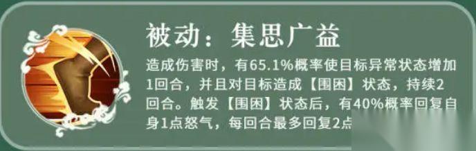 而在被动效果上面,他的集思广益技能是在造成伤害的时候可以触发的,此时会有65%的概率,可以让敌人身上的异常状态持续生效一个回合,那么此时对敌人造成的困围状态也会有更多生效的时间,会持续两个回合的时间,这个困围状态生效之后,还有40%的概率可以给自己带来一点怒气的恢复,这个技能被动是可以多次触发的,但是一个回合里面最多恢复的就是两点。