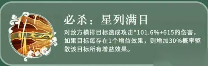 大家使用徐庶的话他普攻技能上面就可以进行点杀,而且必杀技也算作是一个大范围攻击的大招,在大范围攻击之后还可以产生一定的影响来施加给敌人,所以他可以给敌人造成中毒状态的情况下带来的大范围输出,就是徐庶最大的输出特点,他的优势就是可以驱散对方以及限制对方的一些增益效果,那么在技能上面,他的必杀技叫做星列满目,这个技能可以对敌方横排的目标全部造成攻击,选择一个横排对其中的所有目标造成的攻击百分比达到101%,当然此时带来的固定点还有615的固定数值伤害,如果目标此时身上还有增益状态的话,使用这个技能迅速进行攻击,还会增加30%的概率,可以驱散敌人身上的增益效果。