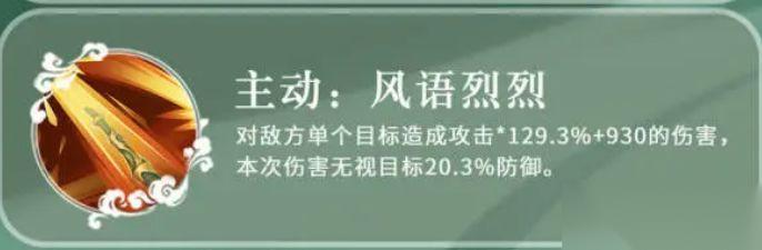 他还有另外的一个主动技能叫做风雨烈烈,这个技能是需要大家手动使用的,目标是敌方的一个单体目标,造成的攻击数值达到了129%的数值,此时的固定伤害是930点的伤害,而且这一次的伤害可以直接无视掉敌人身上20%的防御,在他的被动,也就是春雷震技能上面,可以带来一个忽视反震的效果,此时他提升的自身忽视反正数据达到了21%,并且还可以在攻击敌人的时候带来无视11%防御的效果,如果大家使用星列满目的时候触发这个被动的话,还可以对被驱散增益的敌人带来伤害提升的效果,这里提升的数值达到了42%,如果是用到被驱散的增益敌人身上,此时的伤害数值不高于他自身的数值,那么此时还会触发一个集思广益的被动,所以徐庶各个技能之间的连系触发效果,是可以达到一个回合里面多次触发的。