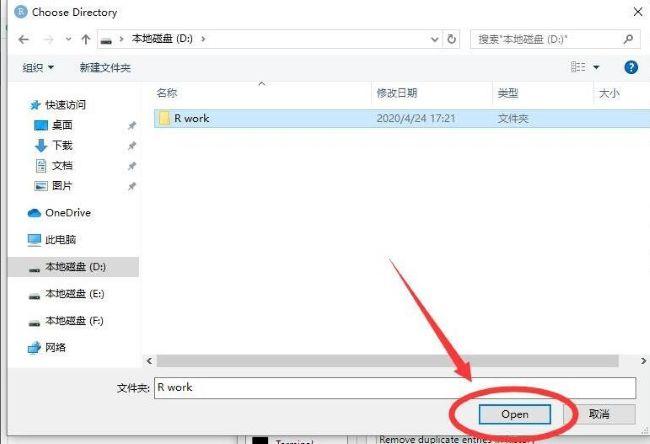 7、在打开的窗口界面中,选择一个合适的目录位置,点击"open"按钮。