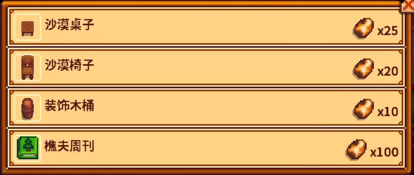 小二推荐大家重点关注五彩碎片和魔法糖冰棍,分别去艾米丽商店(500个卡利科三花蛋)和最后一天的卡利科三花蛋商人(250个卡利科三花蛋)。对了差点忘了,还有沙漠节厨师这里推荐选樱桃糖浆和洞穴面包做水晶蛋糕,可以获得七分钟的3级采矿外加1级幸运的提升,下矿必备。