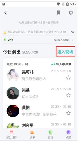 听果音乐app怎么看现场,打开听果音乐app,点击现场板块,可以看到会有各种各样的演出,点击进入现场,或者订购位置去店里,随后就可以查看本场阵容和什么时候开始。