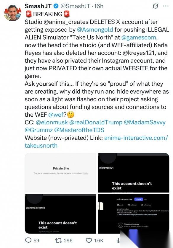 根据报道,该工作室的官方X账号被删除外,创办人Karla Reyes也删除了他的个人账号,该公司的ins账号也被设为私人,甚至《Take us North》的官方网站——曾经用于推广游戏并连接其众筹的项目也被锁定在私人墙后。所以按照目前的情况来看,当人们开始调查该工作室的关系时,它就消失得无影无踪了,既没有捍卫他们的计划,也没有解释他们的艺术选择或者正面回应批评,而是选择逃避。