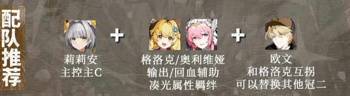 而在配队的推荐上面,莉莉安还可以作为阵容当中的主要控制以及主要核心输出角色使用,那么第二个位置上,大家放格洛克或者是奥利维亚都是可以的,这里格洛克的话是可以帮助莉莉安来补足一些输出的,然后如果放奥利维亚的话,为队伍带来的则是治疗以及辅助类型的效果,这两个角色目前都是可以跟莉莉安放在一起凑光属性的羁绊加成的,所以如果有需求的话,大家根据目前队伍上场的情况来进行判定,如果上场的对手是输出比较强大的角色,那就上格洛克来保证我方的输出数据能够足够应对对方,如果对方的异常攻击比较强大的话,大家就可以让奥利维亚放在这里,来保证队伍有足够的生存能力。