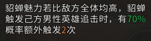 由蔡文姬给吕布余音BUFF,有概率额外释放追击技能,搭配貂蝉额外触发2次追击,可以多次触发吕布的天赋技能以及追击技能,不断增幅吕布武力打出高额伤害。