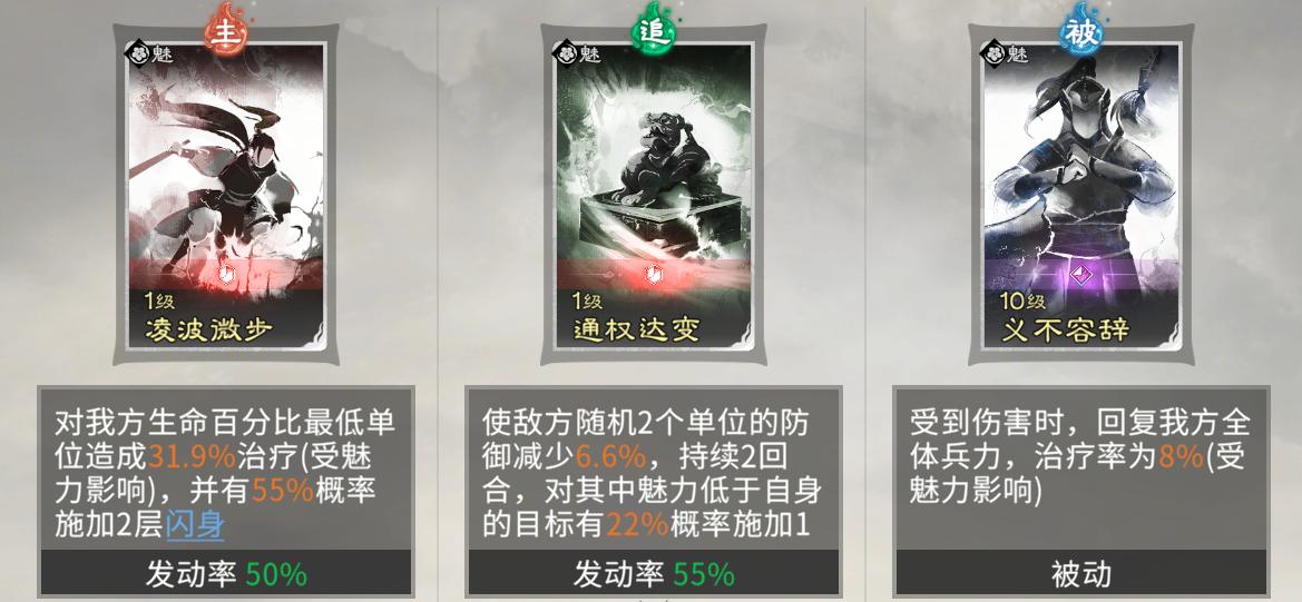 这里要注意貂蝉技能尽量选择高阶级的魅力技能,为貂蝉提供魅力属性,保证貂蝉魅力比敌方全体均高。蔡文姬可以不带追击技能,因为吕布的追击格只能给蔡文姬、貂蝉其中之一,貂蝉和蔡文姬的追击格都需要给吕布,这样会有一个英雄吃不到追击格,但是貂蝉必带3个技能增加魅力,蔡文姬可以不吃追击格不带追击技能。