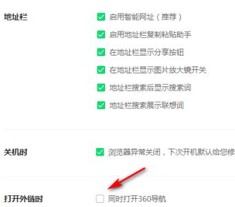 3、进入到新的窗口界面后,找到右侧中的"打开外链时"一栏,将其中的"同时打开360导航"小方框取消勾选即可。