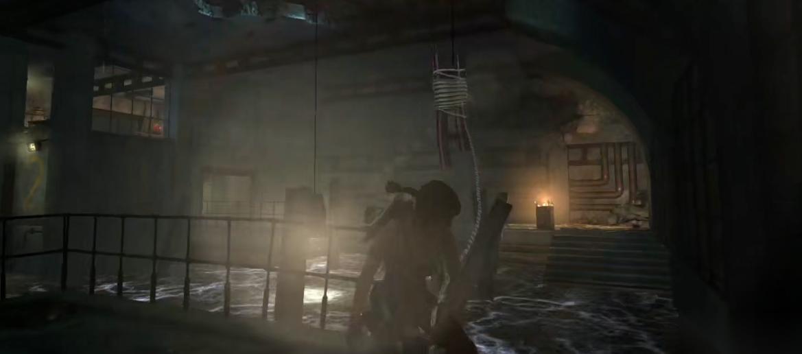 到了对面别忘了把木筏拖到吊灯正下方。再次拉动重物让吊灯升起,等它落下时就会被木筏卡住无法浸入水中,这样水池就永久断电了。现在可以放心从原先绑木筏的地方涉水,爬上楼梯去二楼拿宝藏。整个过程要注意节奏,特别是拉重物和移动木筏的时机要把握好。