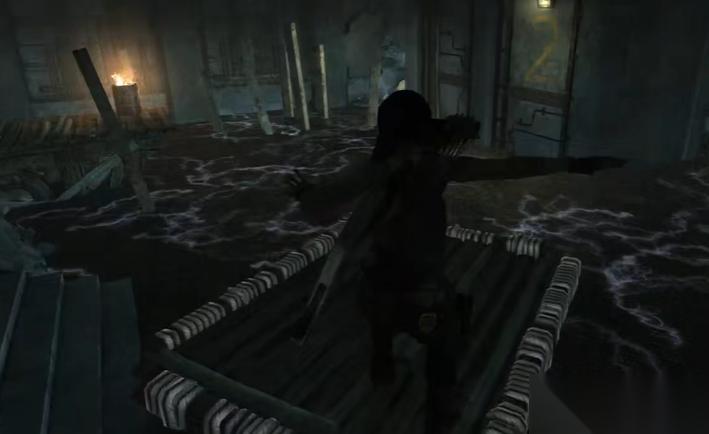 遇到带电水池时,咱们先别急着下水。打开大门后立刻去左手边,用火把烧掉栓住木筏的木桩,这样就能让木筏自由漂浮。接着去右手边用霰弹枪打碎障碍物,把木筏拉过来当垫脚石。这时候关键操作来了,拉动场景中的重物让带电的吊灯升上去,水池就会暂时断电,抓住这个时机快速通过到对面。