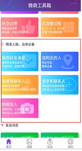 1、下滑首页找到【精准人脉,出单必备】这几个功能都可以自动加好友,为您列举两个例子!