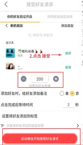 2、在【接受好友请求】中玩家选择自己接受的好友数量,与指定标签后就可以启动微信开始自动接受好友的请求了!
