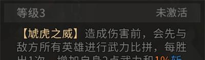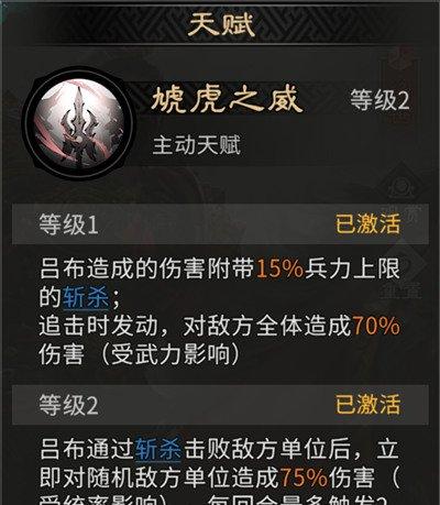 吕布的天赋技能十分依靠追击行动,吕布最好吃满另外2个队友的追击格。吕布的天赋技能1级就十分强力,自带15%的斩杀以及追击时的70%的全体伤害,等级2可以在斩杀后追加攻击,能够大大提升吕布的收割能力;等级3进行武力比拼提升自身武力以及斩杀上限,大大提升吕布的输出能力。