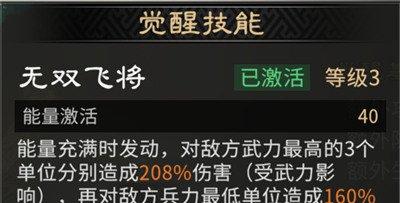 吕布的觉醒技能弥补了吕布天赋技能在对单伤害较低的短版,给到了非常高的单体伤害,以及对最低兵力的锁定伤害,这里觉醒的伤害也是可以触发天赋技能等级1的斩杀以及等级2的斩杀后追击伤害。吕布的天赋技能是非常强力的,这里非常推荐除三皇外优先觉醒吕布。
