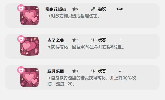 休息回复就可以直接回30%的血,作用于日常还是足够的。更厉害的是还有一个应激反应,普通的情况下大概就可以回25%的血,要是遇到对手防御反击,那就可以直接回80%的血。残血反打,那全部都需要靠他。另外还有一个赤子之心,不仅可以回40%的血,而且还可以获得6点能量。整体的性价比还是比较出色的,除此之外增益技能也是主要的亮点。柔弱可以把敌方的物理性攻击还有物理性防御直接下降70%就可以给我方创造出更多的机会。
