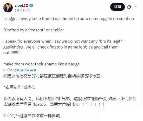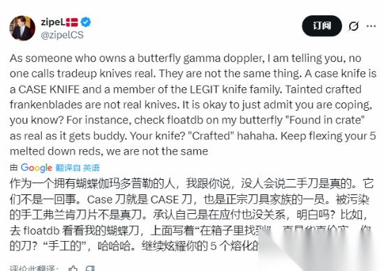 zipeL在推特写道:“作为一个拥有绿宝石蝴蝶刀伽玛多普勒(的人,我可以告诉你——没人会把‘合成刀’当成真正的刀。那根本不算数。