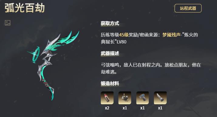 如果大家不知道怎么选择这里弓箭类型武器的话,大家可以直接选择弧光百劫这个武器,它在游戏当中达到了5星级别,而且在弓箭类型输出上面是非常实用的,外观设定也是非常高的,其中的弓箭带来的射速能力也是非常高的,而且可以在光环的指引下来增加大家瞄准的精准度,所以在操作上面相对来说上手的难度没有那么高,特别是新手第一次接触弓箭类型的武器的话,这把武器它有瞄准加成机制的话,也可以带来更多的输出达成率。