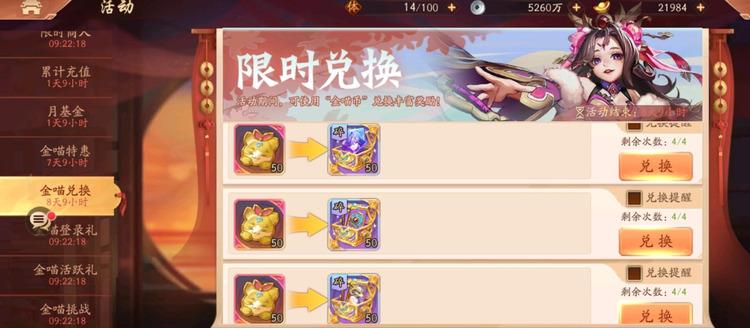 在金喵兑换界面,玩家可以用金喵币兑换各种物品,包括优质军师、武将和法宝碎片箱。这种盒子的兑换比例通常是一对一的,但每个盒子都有兑换次数的限制。除了这些高质量的物品,玩家还可以兑换一些培训资源,每种资源的数量也是有限的。如果你想把这个界面上的所有物品都换成免费的金喵币,玩家只能选择一些重要的物品。