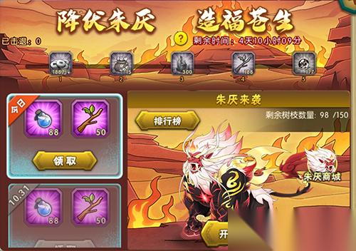 3、活动期间内,可用菩提树枝进行降服,每次降服,有一定几率获得额外奖励,使用“搬救兵可立即击杀朱厌,并获得大量奖励。