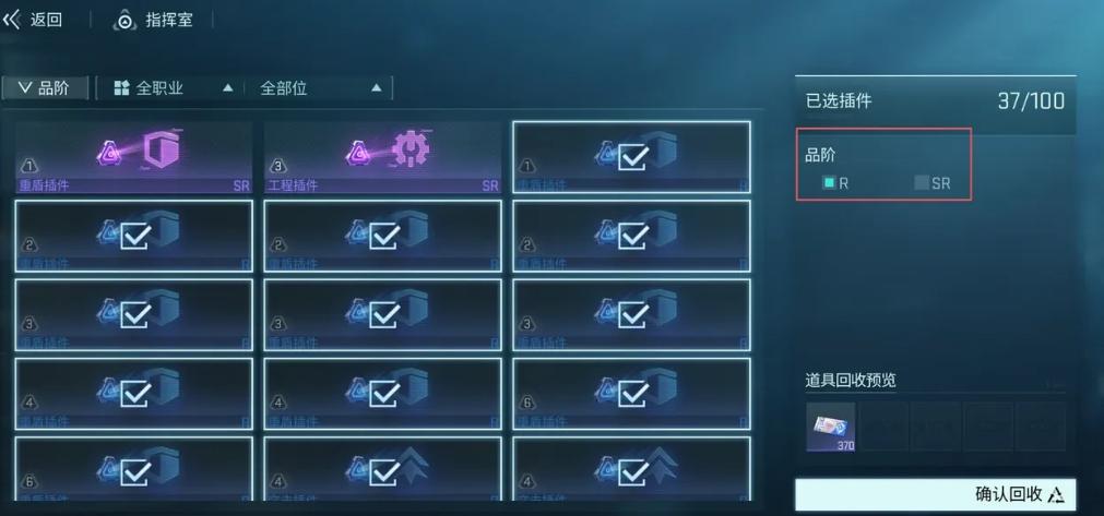 另外就是插件的获取方式,大家可以通过黑盾征募和限时征募的方式来获得。在征募时我们要先获得队员的本体,这样才能获得这个队员的专属插件。其次就是插件的回收,如果大家手上有多余的插件可以进行回收,回收按钮就在队员的插件装备页面,点击右侧的品阶就可以实现批量回收,r级的插件回收之后可以获得信赖之证,sr级插件回收之后则可以获得信赖之光和信赖之证。