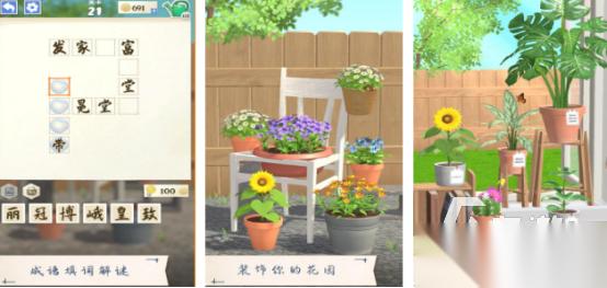 让你的休闲时光不再枯燥无聊,将成语接龙,填空与剧情相结合,玩家成为从大城市回到老家的女孩,告别城市灯红酒绿的生活,来到奶奶的花园当中种花种草。为了让各种花花草草正常的生长,需要完成成语填空或者成语接龙关卡来获得水滴和肥料。此游戏适合不同的年龄段,通过完成关卡积累更多的词汇量。