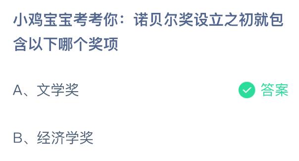小鸡宝宝考考你:诺贝尔奖设立之初就包含以下哪个奖项?支付宝小鸡课堂开课啦!每天花一分钟答题赚饲料,喂喂小鸡就能贡献爱心啦!轻松又意义十足!2025年11月9日蚂蚁庄园的小鸡课堂题目正确答案是【文学奖】,根据诺贝尔奖的设立历史,最初设立的奖项包括物理学奖、化学奖、生理学或医学奖、文学奖和和平奖。