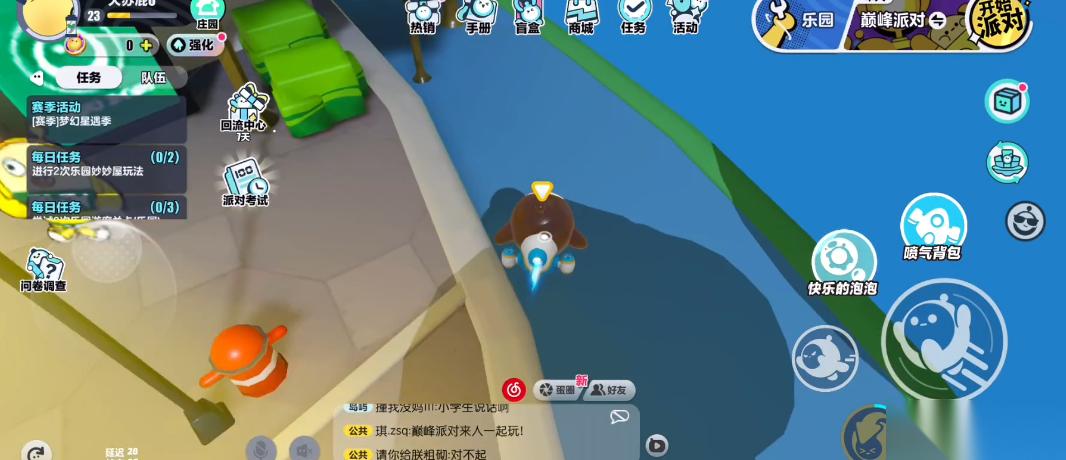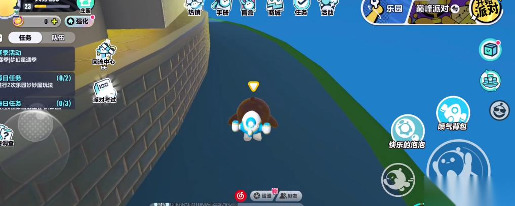 除了这些固定隐藏地点外,蛋仔岛还存在一些特殊互动区域。最右边的大蹦床区域通过特定操作可以让蛋仔变成漂浮状态,触发方式是在开启滚动后向蹦床左上角跳跃,落到星星传送带上会使蛋仔变为透明并在空中传送。这种状态持续期间可以体验独特的漂浮效果。