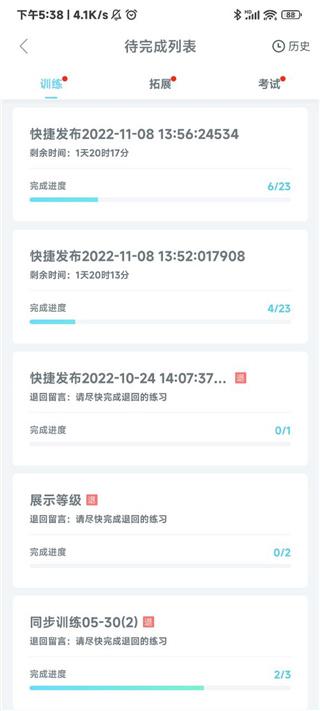 4、返回上一级点击右上角的历史,这里可以查看你做过的训练成绩和考试成绩;