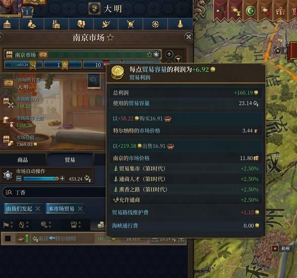 一共从香料群岛进口了16.91的丁香,售价减去进价减去贸易维护费,最后算出来总利润是160.19,非常可观,然后乘以当下的王室力量37.44%,得出一个59.975的数值(四舍五入为59.99)。