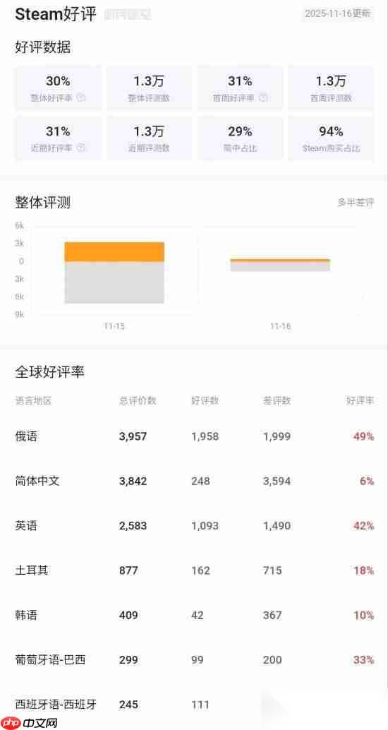 根据本站统计,《逃离塔科夫》在Steam平台简体中文区的用户评价已跌至“差评如潮”,当前好评率仅为6%,整体评分也从原先的41%下滑至31%。作为参照,国产卡牌游戏《三国杀》在Steam简中区的综合好评率为10%。