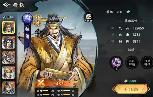 张角有着足以比肩红将的强度,他可通过释放怒气技,让己方所有部队都能获得护盾的庇佑,而且他有着很优秀的回怒能力,怒气技的冷却时间也较短,所以能在战场上通过频繁为己方加护盾来提高队伍的整体生存能力,也令张角能牢牢占据一个群雄队的上阵名额。