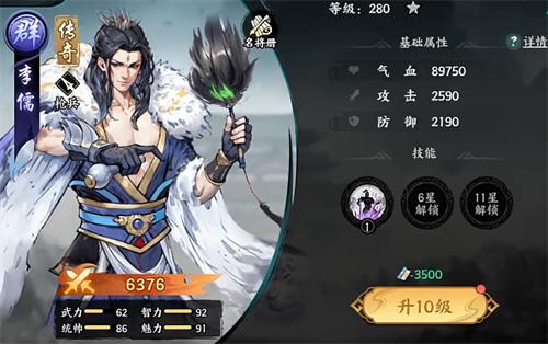 十分优秀的枪兵职介武将,怒气技放出的地矛不光伤害高,还能对处于麻痹状态的敌人施加破甲效果,降低他们的防御能力,令己方所有武将能打出更高的输出,这也使得李儒有着很出色的辅助能力,搭配上华雄更是会产生非常不错的联动效果。