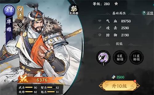 初始零星时就有不错的坦度,若是能升到6星,那么在解锁了第一个被动技后,华雄的防御能力还会再上升一个档次。等他升到11星后,新被动悍不畏死配合上怒气技对敌方施加的麻痹效果,可令己方血线最低的武将能得到护盾的庇护,让华雄也能具备很不错的保人能力。