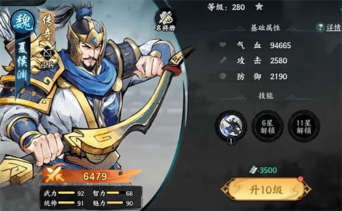 能帮助魏国阵营施加寒冰效果的橙色武将,怒气技所覆盖的范围非常大,自身也能打出高额的伤害,因此在玩家魏国队伍尚未组出全红将阵容时,夏侯渊能在魏国队中获得很多的就业机会。配合上11星时的被动千里袭敌还能让夏侯渊快速回怒,从而能更频繁地去释放怒气技。