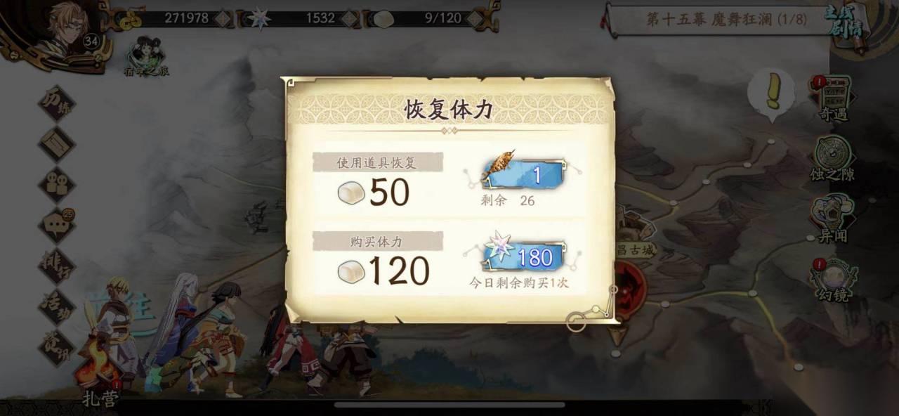 钻石购买体力值,从最便宜的40钻石到200钻石总共可以购买6次,建议玩家购买到140钻石封顶,因为200以上的钻石都可以抽几次卡了。每天在日常任务中也可以领取到3个烤鱼,一个烤鱼等于50点体力值,另外有个日常任务可以直接获得60体力值。(体力值没地方用的话可以去扫荡蚀之隙,刷一些材料给后续的英灵使用)
