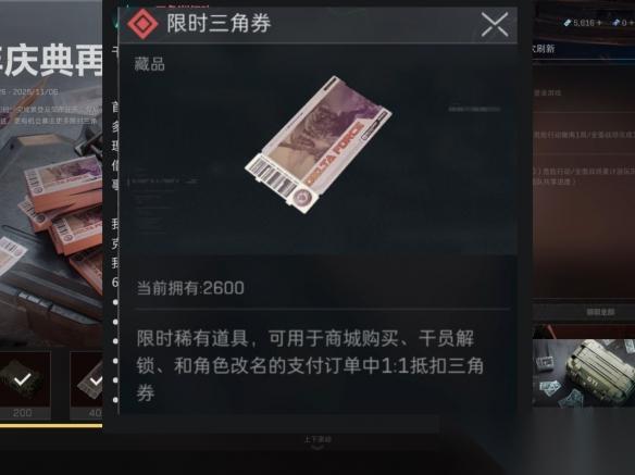 完成烽火挑战、救援任务等,可获得装备兑换券,间接兑换三角券。