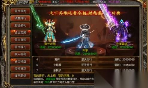 在游戏中,排行榜的设定加入了激烈的竞争机制,促使玩家不断挑战自我。排名第一的玩家需要投入高达6000万传奇币,才能获得包含盖世武器、衣服以及首饰的自选宝箱,这样的奖励极大地激发了顶级玩家的争夺欲望。紧随其后,第二和第三名的玩家只需投入3000万传奇币,即可获得盖世衣服和首饰的自选箱子,这种阶梯式的奖励体系合理平衡了不同层次玩家的奖励期待。此设计不仅推动了高消费玩家的激烈竞争,也为中等消费玩家设立了明确的目标,激励他们不断提升实力,争夺更高的排名。