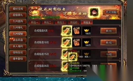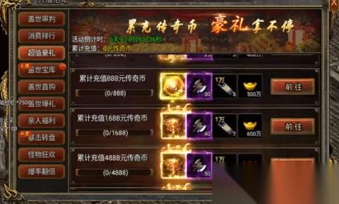 活动的亮点之一是盖世神判环节,玩家需在七天内完成特定的充值和任务目标,才能开启丰富的奖励内容。充值传奇币达到一定额度后,玩家不仅可以获取盖世装备,增强全属性15%的战斗能力,还能获得盖世首饰自选箱,为角色搭配提供更多自由。