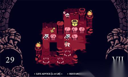 一个结合了推箱子解谜和文字冒险玩法的游戏,玩家需要在地狱中通过解谜和对话征服各种恶魔妹子,游戏总共设计了十个关卡,每个关卡都是一个推箱子谜题,每关结束和恶魔少女进行对话提升好感度,攻略成功后玩家还能使用对应的特殊能力。游戏中把路西法等地狱魔王都改成了各种性格的恶魔少女,而且还设计了很多个性化皮肤。