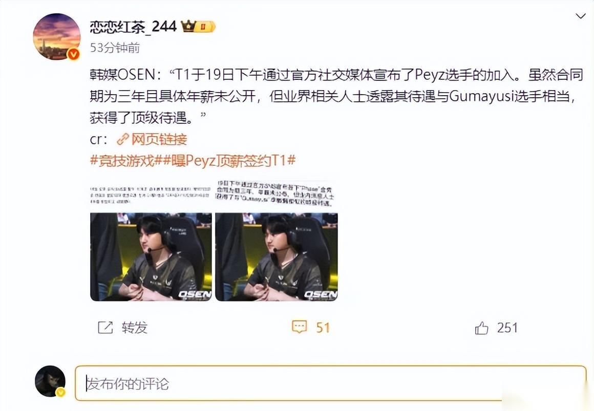 最终的结果大家也都看到了,那就是T1已经官宣了Peyz加入,一签还是三年。T1选择Peyz也是有原因的,那就是Peyz很便宜,究竟便宜到什么地步呢?那就是一年只有50RMB。小吕布和T1谈的薪资差不多是在1,000万RMB左右,这中间直接差了20倍。Peyz本身还是很有实力的,他是LCK最年轻的冠军AD,加上FMVP。在这种情况下,Peyz的性价比远超任何一名AD选手。对于Peyz本身来说,他家里是比较有钱的,现在一心想回到LCK,而且是想找一个能出成绩的队伍,T1自然就是最好的选择。一方面他不会觉得自己薪资低,而且他能够接受轮换。