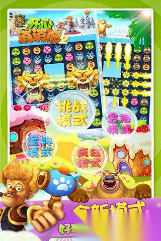 官方自己出的一个休闲消除类手游,采用经典的三消机制,3个及以上相同动物头像或特殊头像连成一线就能消除并获得分数,关卡中也会随机刷新炸弹、时间冻结等道具。游戏主线分成了5个章节,每个章节有十来个关卡,剧情主要是帮熊大、熊二对抗光头强的陷阱,解救被困动物,游戏支持离线运行,非常适合给孩子玩。