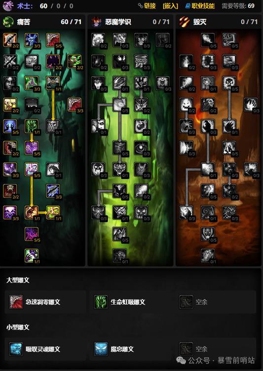 天赋加点顺序:10级起优先点1-2点腐蚀术,随后投入1点镇压,转向毁灭系至22-23级点出暗影灼烧。27级后强化吸取灵魂以优化回蓝,最终优先夜幕、双延伸等关键天赋。
