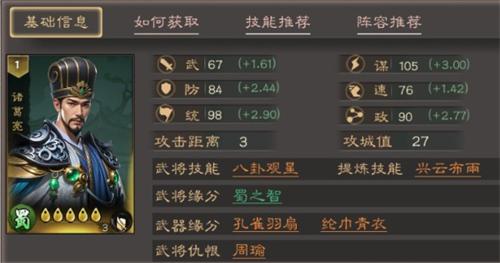 诸葛亮是核心控场+谋略辅助型武将,谋略属性(105)顶尖,自带技能“八卦观星”兼具减益与控制,是当前版本T0级辅助核心,适配各类依赖控场的阵容。