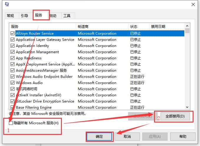 2、然后在“系统配置”窗口中的“服务”选项中,点击击勾选“隐藏所有 Microsoft 服务”前面的复选框,然后单击“全部禁用”,如图所示。