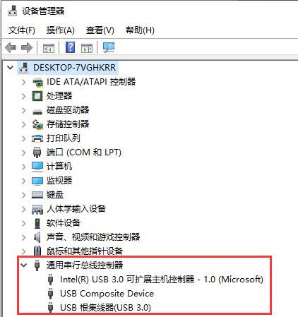2、然后在“设备管理器”窗口中展开“通用串行总线控制器”,将里面所安装的USB启动逐个检查驱动并进行更新,如图所示。