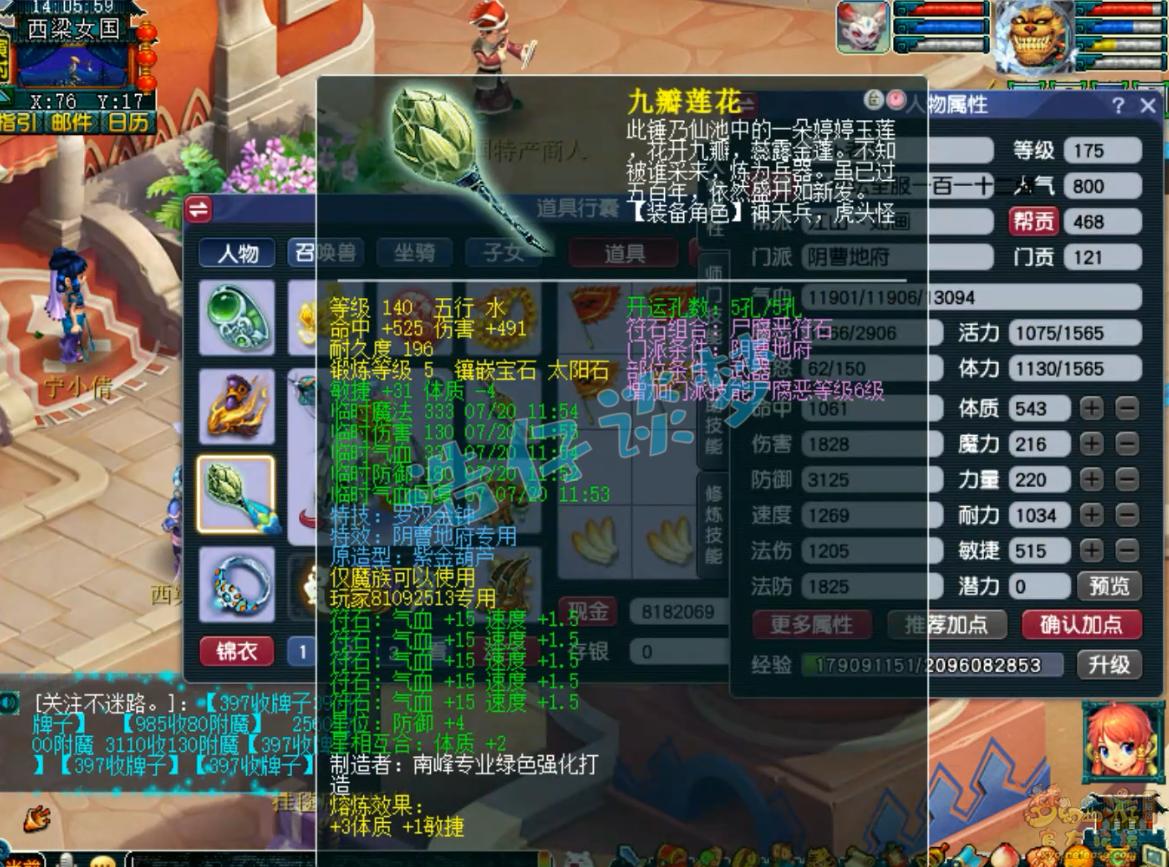 140级罗汉金钟武器,熔炼后加32敏、减1体,打了5锻太阳石。