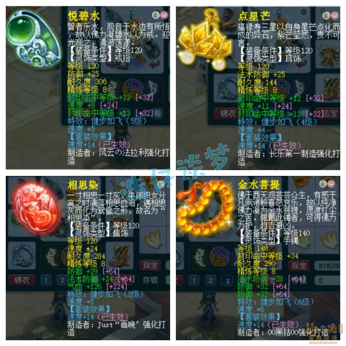 戒指和耳饰下排都是双封印一速度,配饰下排气血防御法防,手镯下排双防御一法防,全部打了8锻星辉石。