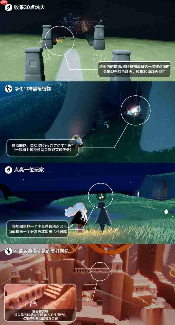 ③ 收集30点烛火(或表述为“点燃30根蜡烛”)→ 在全图任意地图探索收集烛火,累计达30点即完成;霞谷大厅、溜冰场、霞光城等区域烛火分布密集,推荐优先清扫。