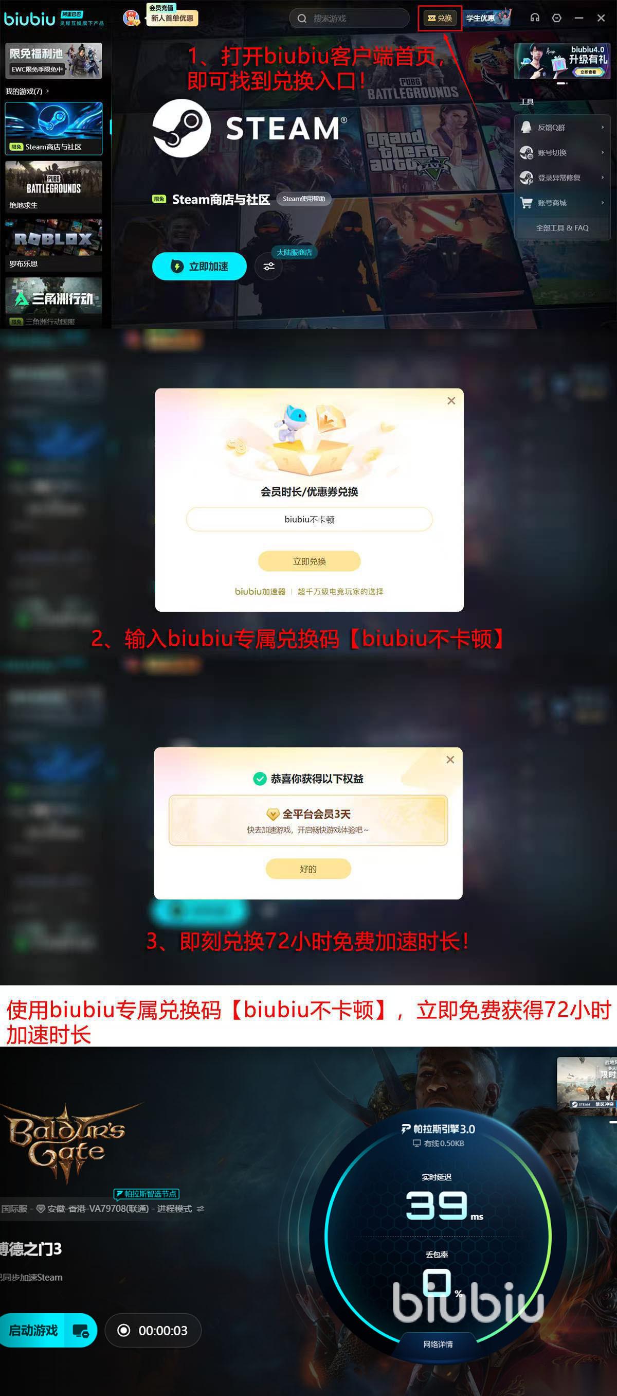 经过biubiu加速后的博德之门3,能给大家带来的改变包括,登录速度更快,战斗更流畅,虽为回合制但日常画面帧率更稳定。如果大家想要尝试,现在还有最多4天时间的免费尝试机会,只需要注册新账号,注册完成就能立刻得到24小时免费体验时长,之后参与会员口令活动,用【biubiu不卡顿】还能在客户端上再得到72小时,因此总计有96小时。